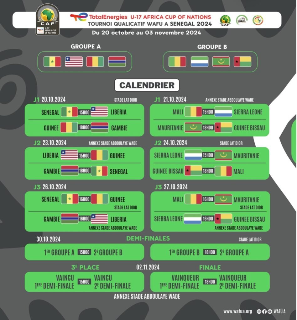 Sous la direction de leur nouvel entraîneur, Pape Faye, qui remplace Serigne Saliou Dia, les jeunes Sénégalais commenceront leur campagne le dimanche 20 octobre 2024. Ils affronteront le Liberia au Stade Lat-Dior de Thiès, avec l’objectif de bien entrer dans la compétition.